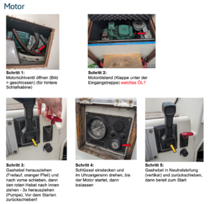 Vor dem Start muss das Motorkühlventil geöffnet werden. Der Ölstand wird über die Klappe unter der Eingangstreppe kontrolliert. Anschließend wird der Gashebel in die Freilaufposition gebracht. Vor dem Startvorgang wird dreimal gepumpt, indem der rote Hebel herausgezogen wird.