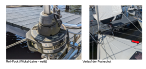 Die Fock wird über eine Rollanlage gefahren und lässt sich vollständig ausrollen, stufenlos reffen oder komplett bergen, ohne das Vorschiff betreten zu müssen. Die Bedienung erfolgt im Zusammenspiel von Fockschot, Wickelleine und Fockfall, wobei jede Leine eine klar abgegrenzte Aufgabe hat.