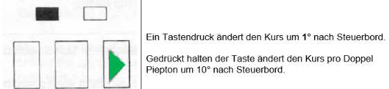 - kurzer Tastendruck: Kursänderung um 1° nach Backbord oder Steuerbord