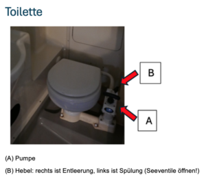 Das WC verfügt über eine manuelle Pumpe. Der Schalter rechts dient zur Entleerung, der linke zur Spülung. Vor der Benutzung müssen die entsprechenden Seeventile geöffnet sein.