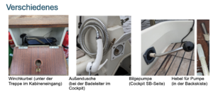 Zusätzlich befinden sich diverse Stauräume im Cockpit und unter Deck. Beim Verstauen von Gegenständen ist darauf zu achten, dass keine Belüftungsöffnungen blockiert und keine Leinen eingeklemmt werden.